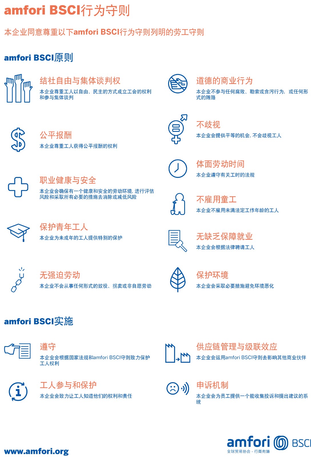 BSCI--商业社会行为准则,商业社会标准行动 (BSCI) 旨在执行一套统一的程序, 通过不断完善发展政策,来监控和促进生产相关产品之公司的社会责任表现。许多欧洲品牌及零售商比如 C&A 、 Coop 、Esprit 、 Metro Group 及 OBI均认可BSCI认证。