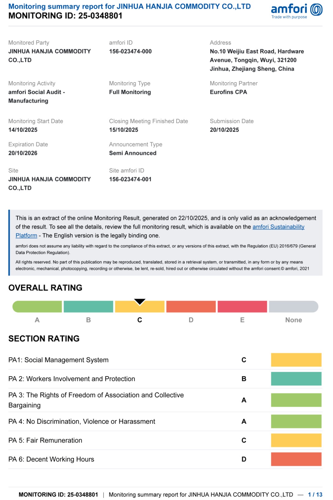 金华市汉家日用品有限公司本年度BSCI审核,在10月14日通过了专业评审,获得了C级认证,这也是客户要求的最低限度等级,本次等级认证有效期为一年。本次BSCI的审核由客户指定EUROFINS机构进行。该客户长期在我司采购红酒开瓶器、酒具用品以及调酒器一类不锈钢产品。